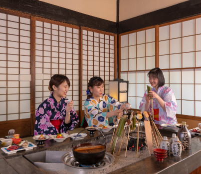 地元の食材を中心に使用した地産地消のお料理をお召し上がりいただけます。当館では当時に思いを馳せ、囲炉裏を囲みながらこの伝承にひたりご賞味いただけます。